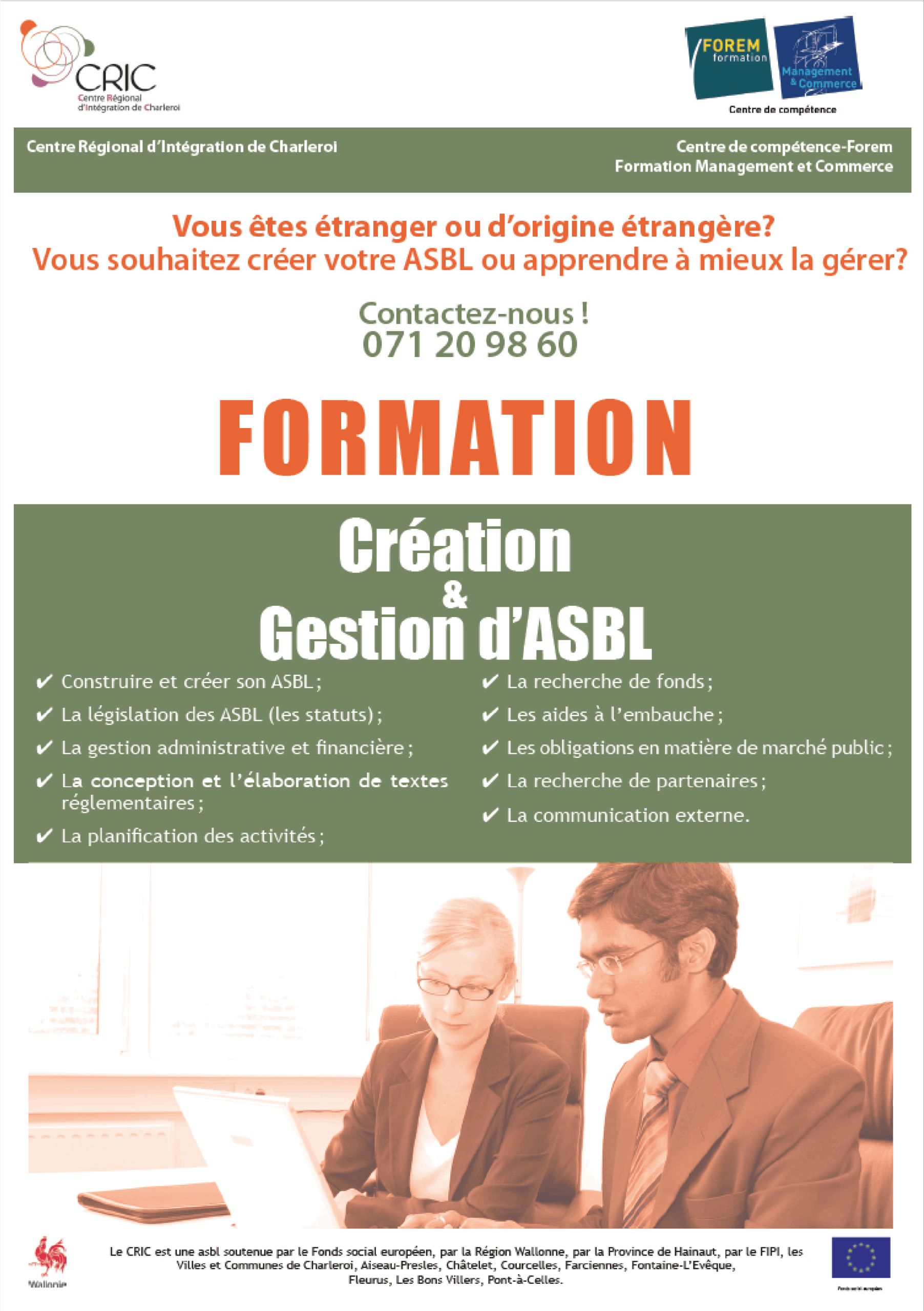 Le Centre Régional d’Intégration de Charleroi (CRIC), en partenariat avec le Centre de Compétence-Forem Formation Management et Commerce de Charleroi, propose la formation « création et gestion d’ASBL»