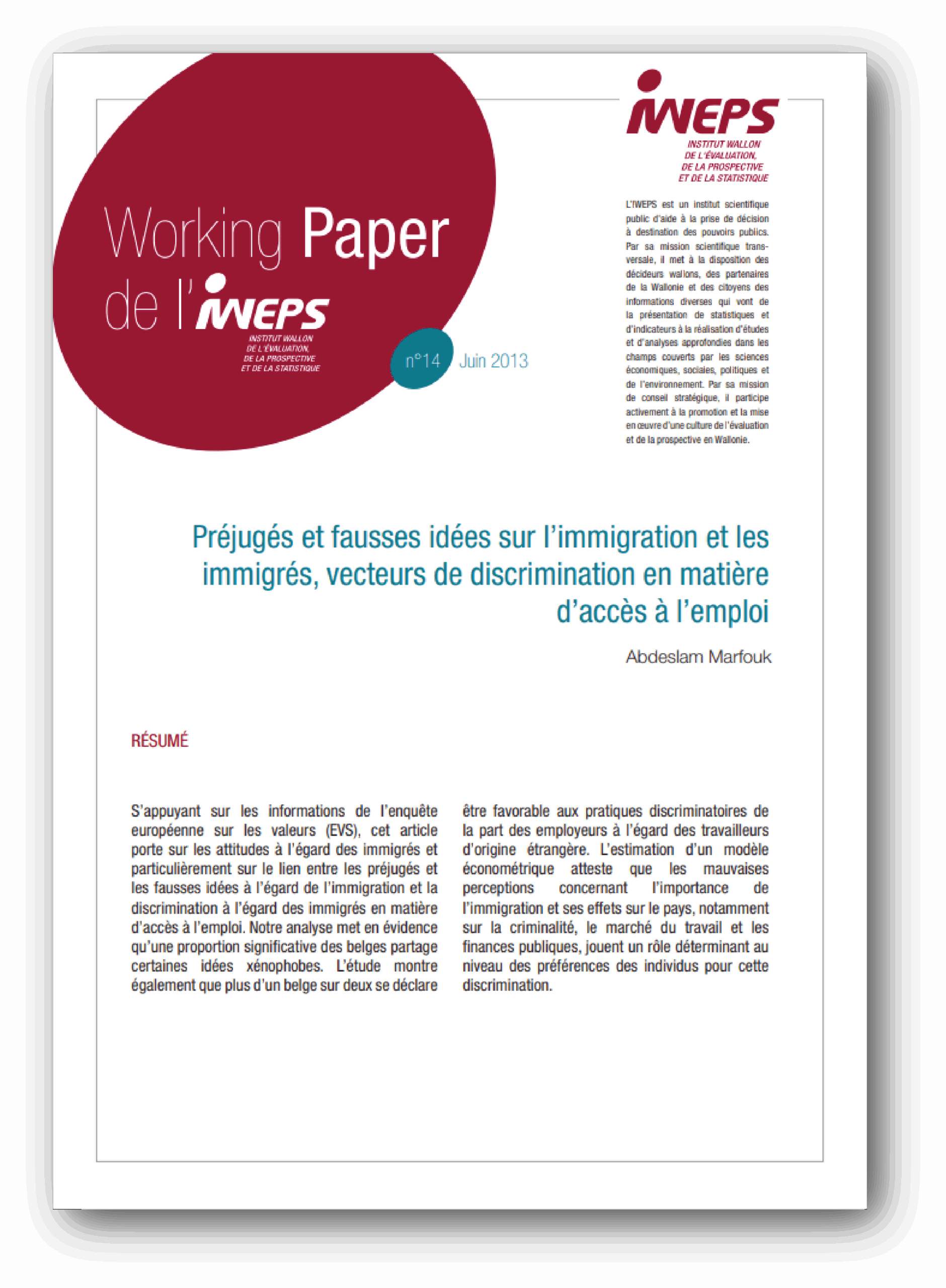 S’appuyant sur les informations de l’enquête européenne sur les valeurs (EVS), cet article porte sur les attitudes à l’égard des immigrés et particulièrement sur le lien entre les préjugés et les fausses idées à l’égard de l’immigration et la discrimination à l’égard des immigrés en matière d’accès à l’emploi. Notre analyse met en évidence qu’une proportion significative des belges partage certaines idées xénophobes. L’étude montre également que plus d’un belge sur deux se déclare être favorable aux pratiques discriminatoires de la part des employeurs à l’égard des travailleurs d’origine étrangère. L’estimation d’un modèle économétrique atteste que les mauvaises perceptions concernant l’importance de l’immigration et ses effets sur le pays, notamment sur la criminalité, le marché du travail et les finances publiques, jouent un rôle déterminant au niveau des préférences des individus pour cette discrimination.