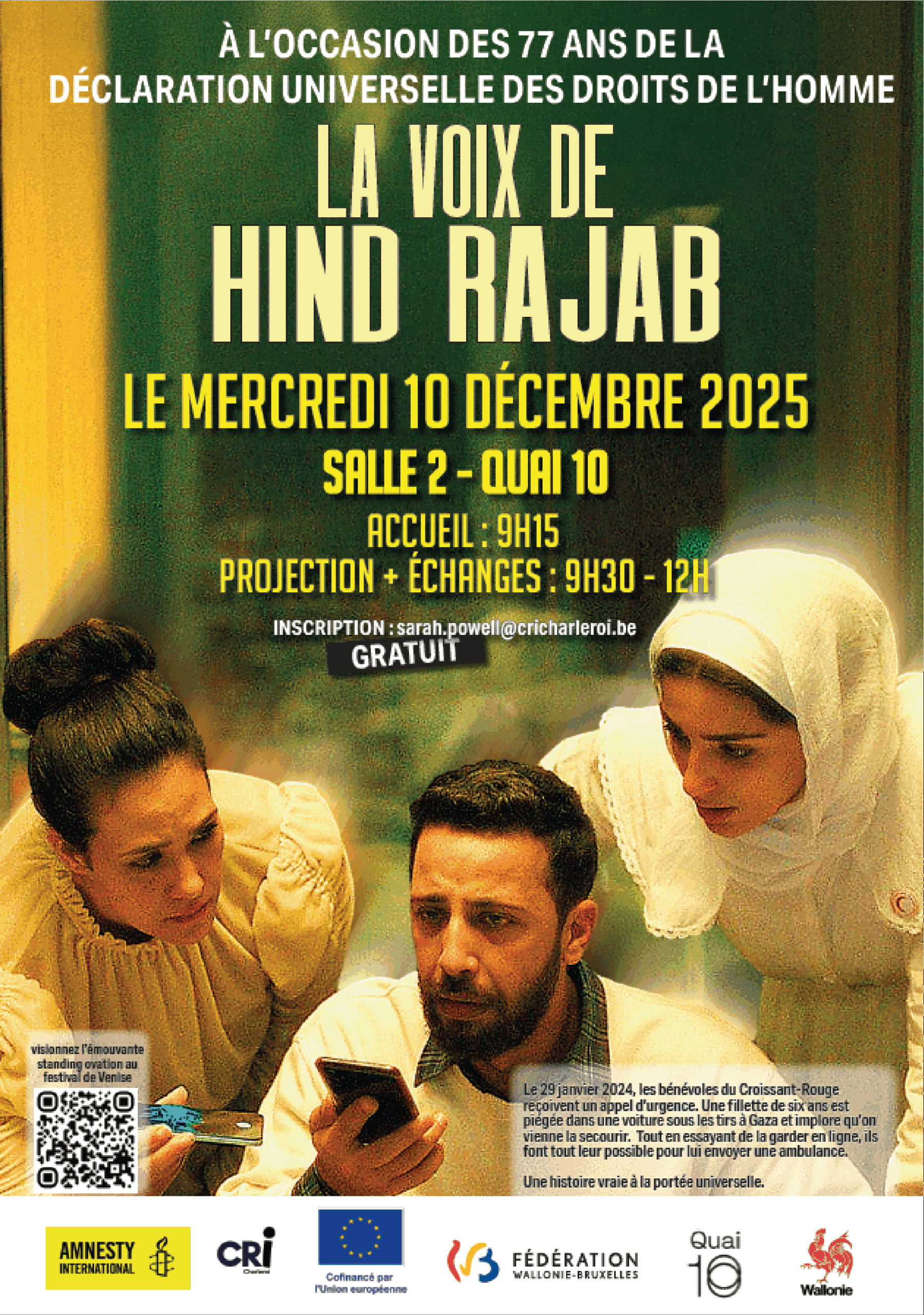 L’histoire bouleversante d’Hind Rajab, 5 ans, tuée à Gaza en 2024. Basé sur les véritables appels au secours enregistrés par le Croissant-Rouge palestinien.